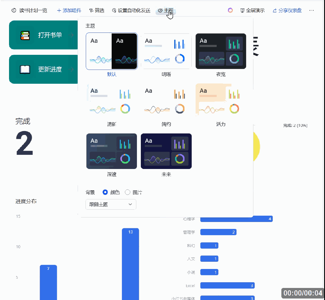 到了图表美化阶段,也不需要设置每个图表元素,通过点窜图表从题,一键轻松给仪表盘换拆,高端大气一秒搞定!